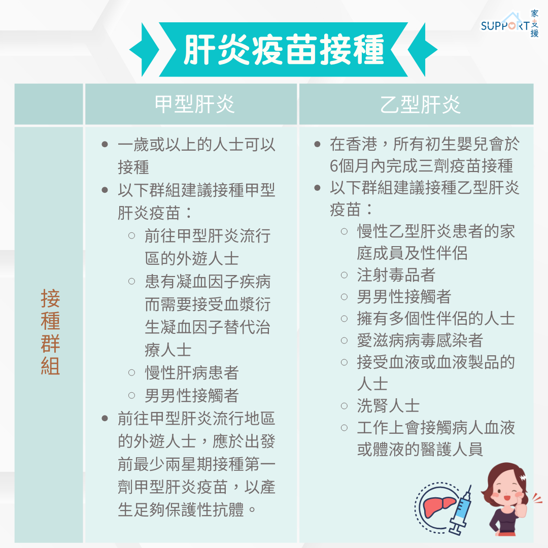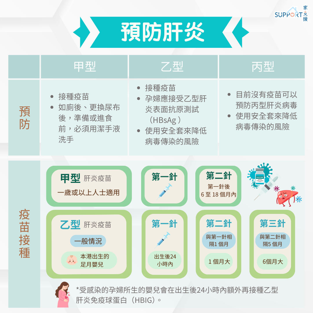 甲型肝炎和乙型肝炎都可以透過接種疫苗來預防;但丙型肝炎暫時仍未有疫苗。因此,我們在日常生活中要保持良好個人衞生,減低感染風險。在香港,所有初生嬰兒會於6個月內完成三劑乙型肝炎接種。