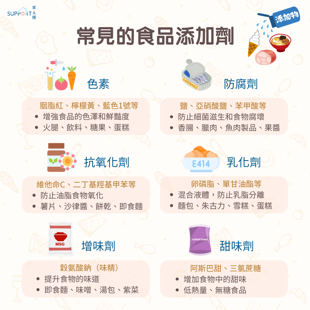 根據香港食品安全中心的分類,食品添加劑可分為23類,常見的包括:
