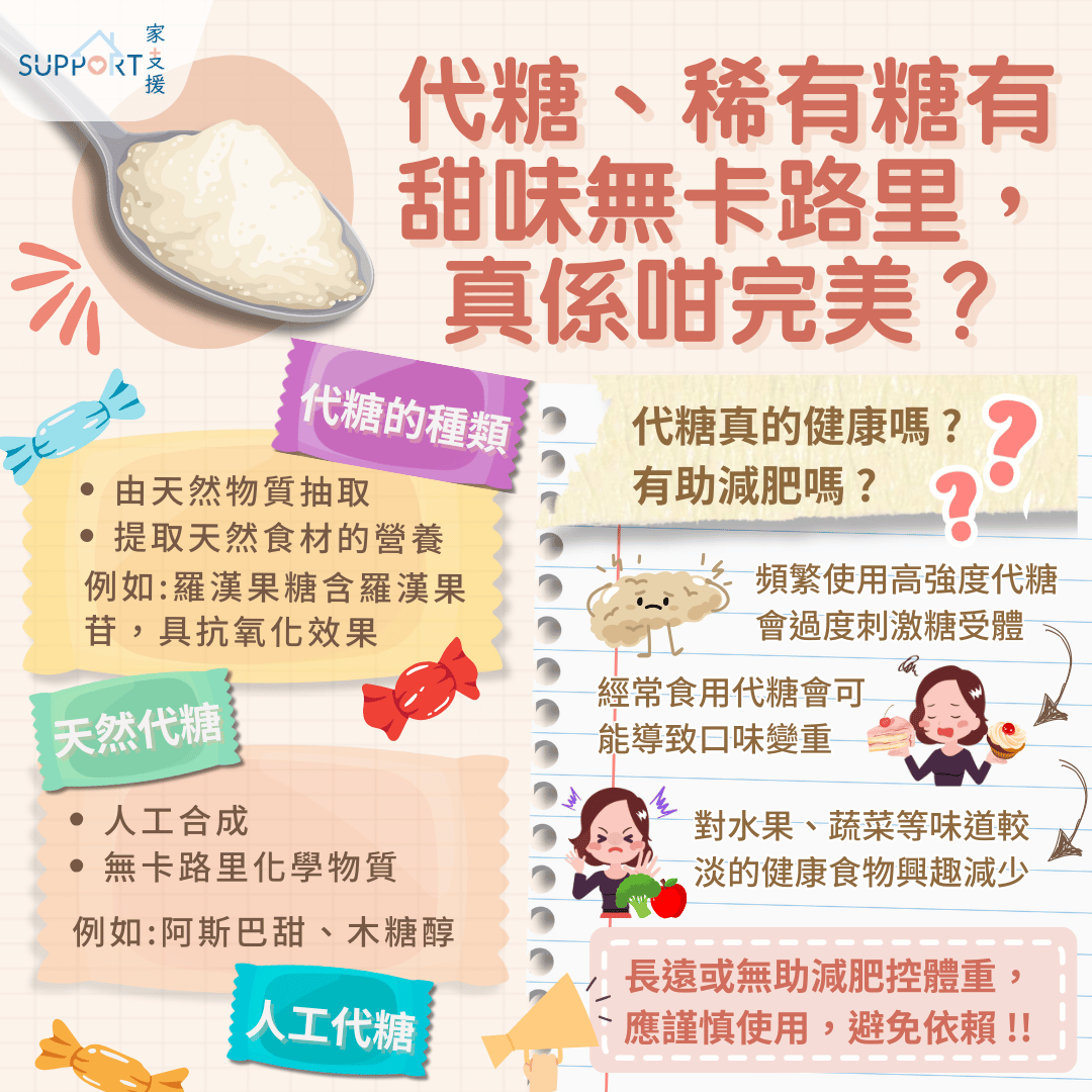 代糖可分成兩類,一種是人工代糖,例如阿斯巴甜,是人工合成;另一種是天然代糖,例如甜菊糖及羅漢果糖。天然代糖由天然物質抽取,除了提供甜味,也有機會提取天然食材的營養,例如羅漢果糖有羅漢果苷,具有抗氧化作用。所以想使用代糖,可選擇更有營養的天然代糖,但要緊記適量食用。