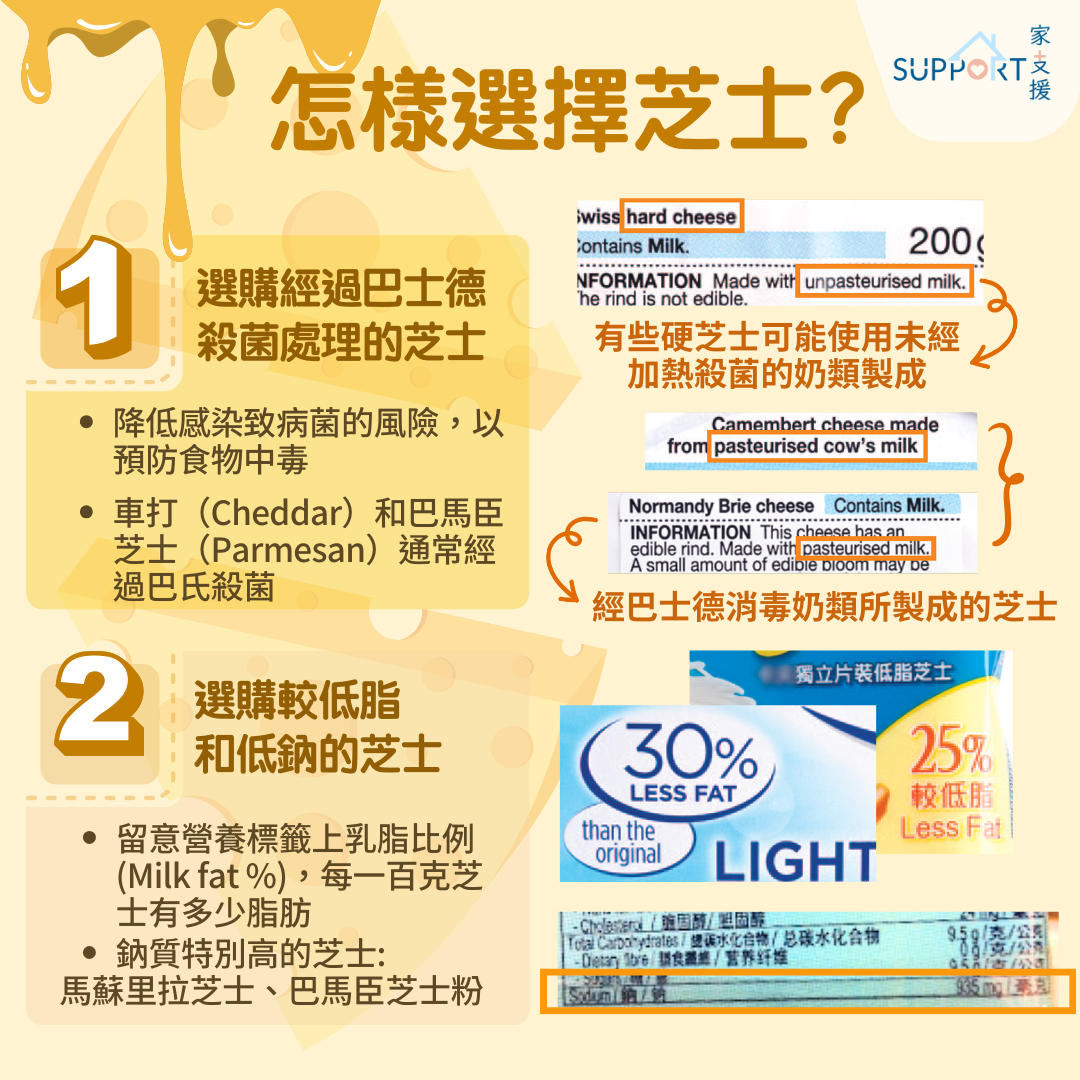 過量攝入脂肪和鈉,會增加患上肥胖症、高膽固醇、高血壓、心血管疾病等慢性病的風險,所以,我們應小心選購較低脂和低鈉的芝士。